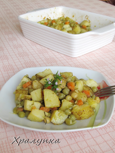 Картофите се измиват много добре и без да се белят, се нарязват на едри кубчета. Морковът също се нарязва на кубчета. Слагат се в подмазана тавичка, като се добавя и грахът (без да се размразява предварително, ако е замразен). Посолява се на вкус, поръсва се със ситно нарязана чубрица и се разбърква. Налива се малко водичка и ястието се пече до омекване на картофите (може да се покрие с фолио). Когато се извади от фурната, се полива с малко ароматен зехтин и се оставя няколко минути, преди да се сервира.