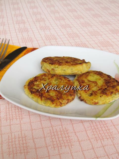 Картофите се сваряват с кората, обелват се и се намачкват. Тиквичките се настъргват на едрото ренде и се посоляват. Оставят се за 10-ина минути да им се отцеди водата и се изстискват. Лукът се нарязва на ситно, също и зелените подправки и всички продукти се смесват, като се добавя и сол на вкус. Сместа се омесва добре, много лесно става с ръка. От нея се оформят кюфтета, овалват се в царевично брашно и се поставят в тавичка с незалепващо покритие (всъщност кюфтетата са много меки и се смачкват, ако трябва да се овалят в чиния с брашно; по-добре става, ако се поръсват с брашното и се потупват и премятат от ръка в ръка).
