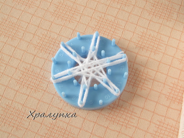 Отстрани на шаблона има процепи, в които конецът се затяга и започва да се намотава по шест от външните шипчета на шаблона по показания начин. Правят се няколко реда (обиколки). Конецът се отрязва и се затяга на някое от процепчетата.